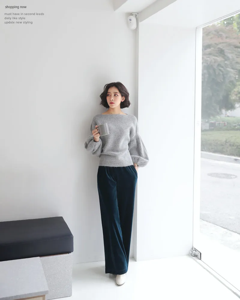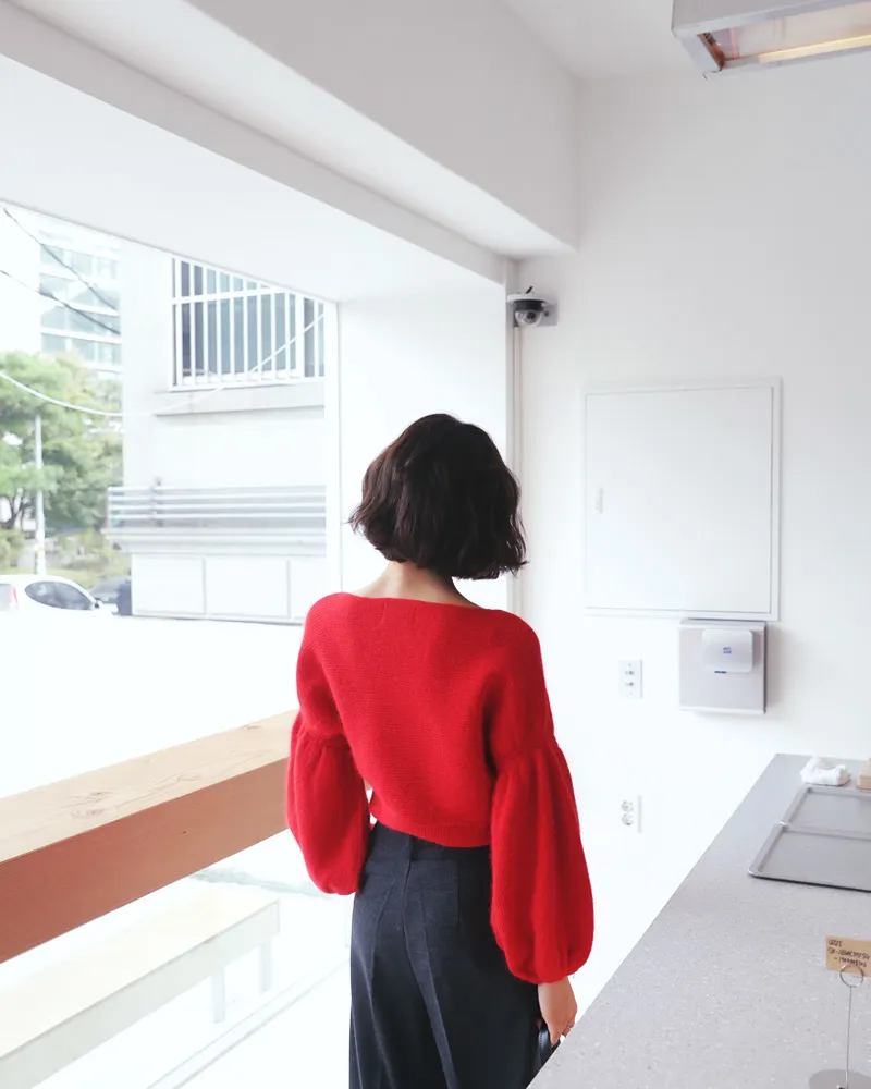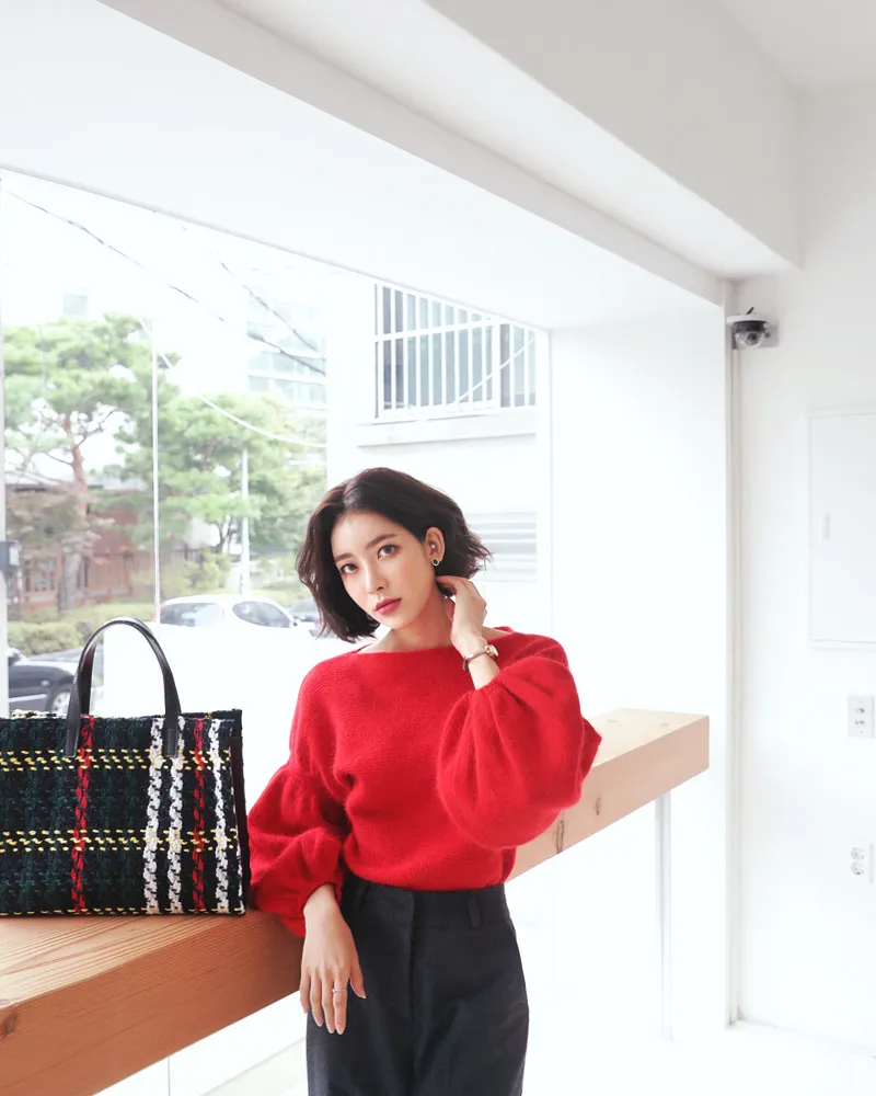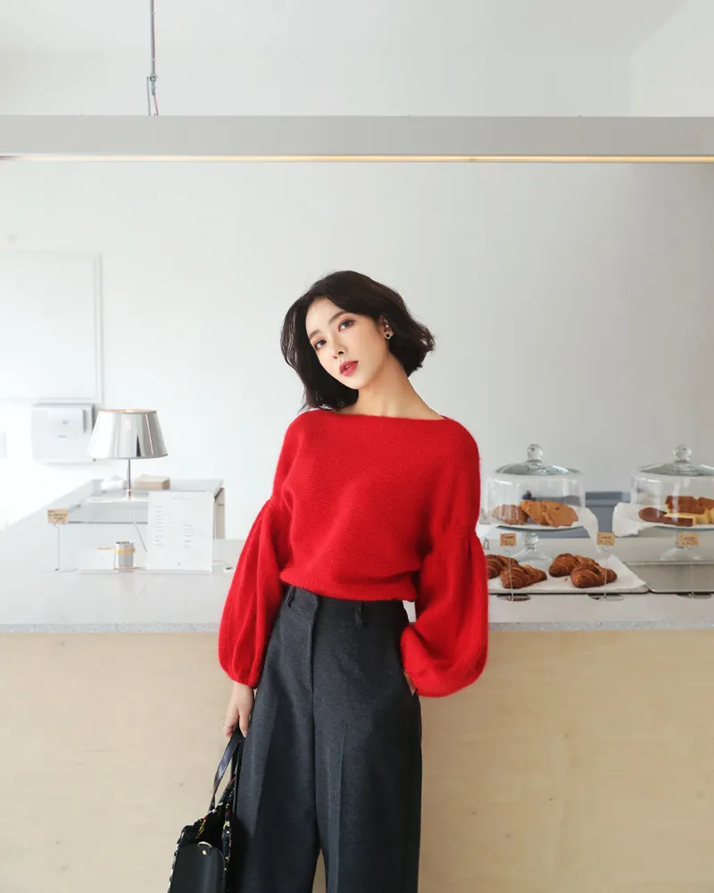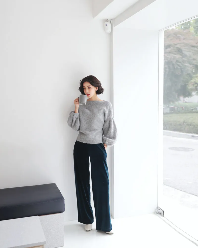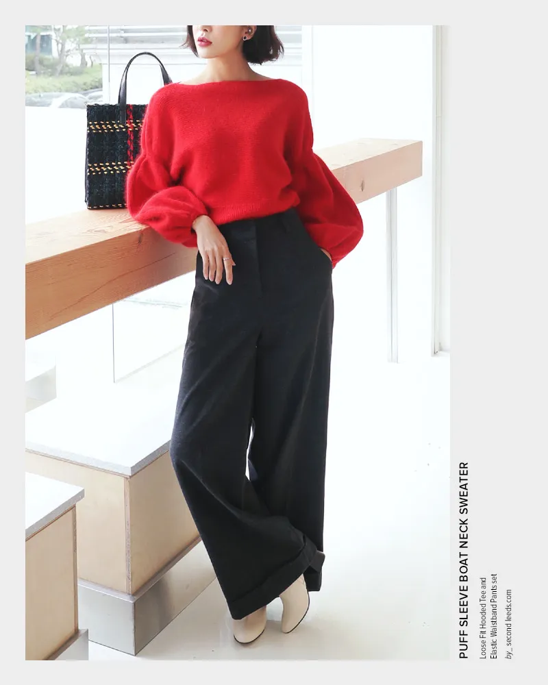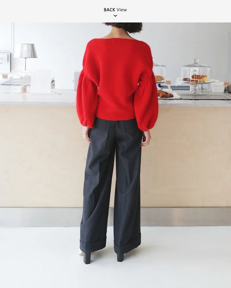 【ボートネックパフスリーブ二ットプルオーバー】