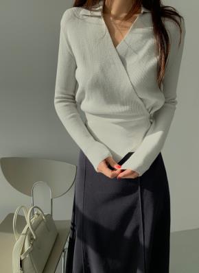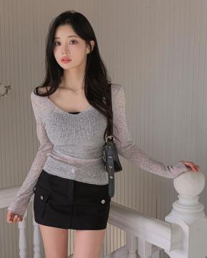 リブオーガンジー長袖Uネックスリムベルスリーブ無地ニット