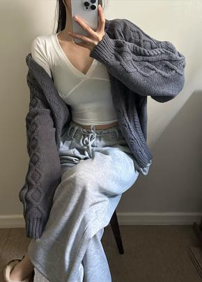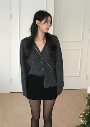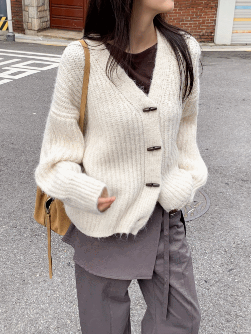 ニットウール混ボタンVネックスリム長袖ケーブルカーディガン