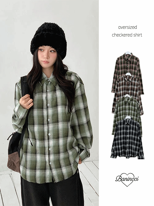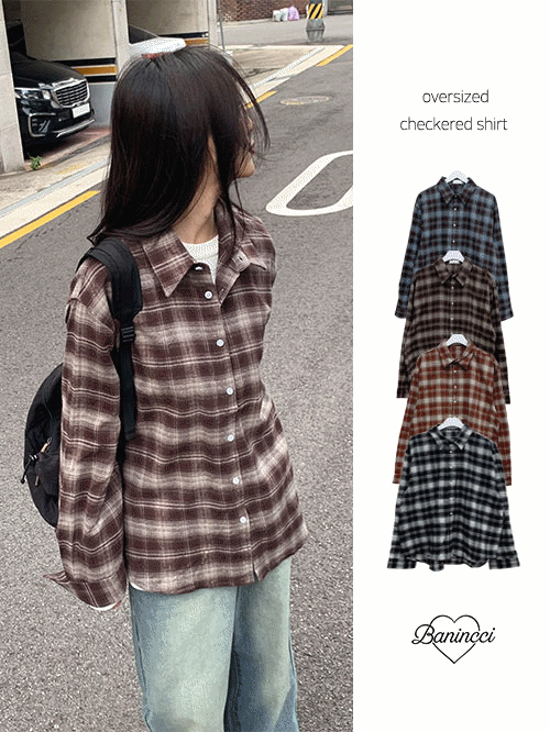 コットンメルトンタッチカラーボタンボタンスリーブルーズオーバーサイズ長袖ビンテージチェックシャツ