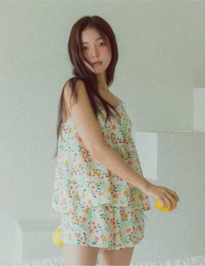 リボンスリットバックゴムウエストゴムショート小花柄パジャマSETカップ付