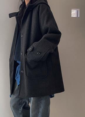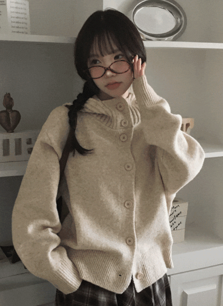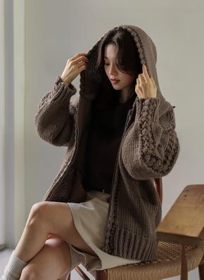 ブークレニットボタンフードポケットルーズ長袖カーディガン