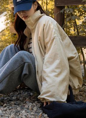 中綿ジップアップフードドローストリングルーズ長袖ダウンジャケット