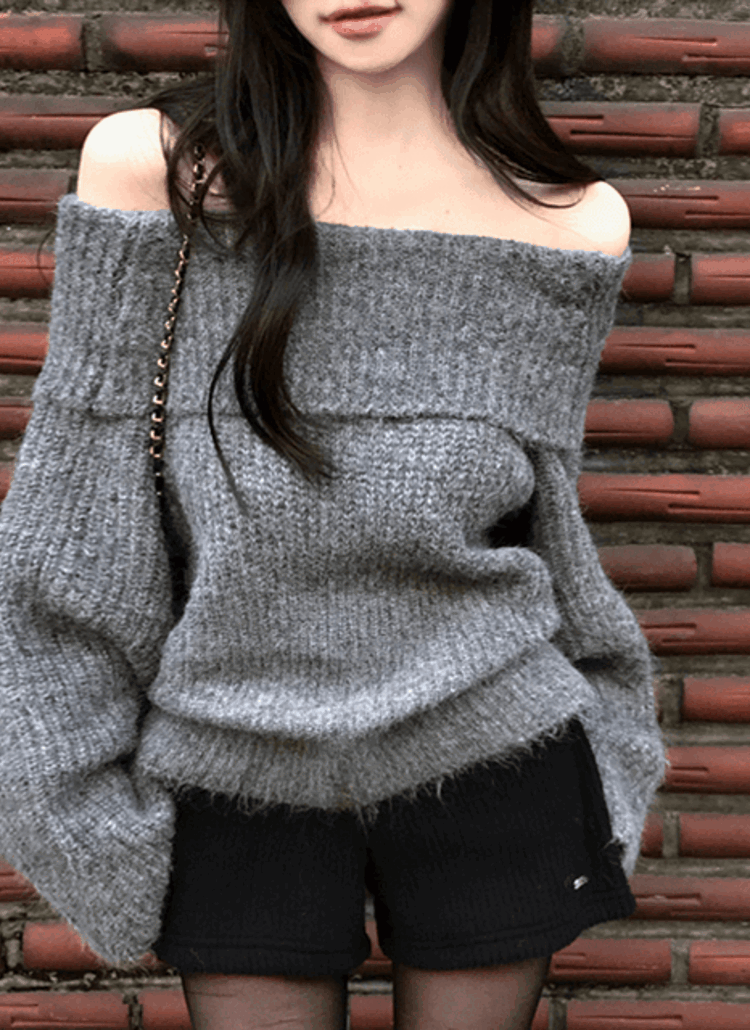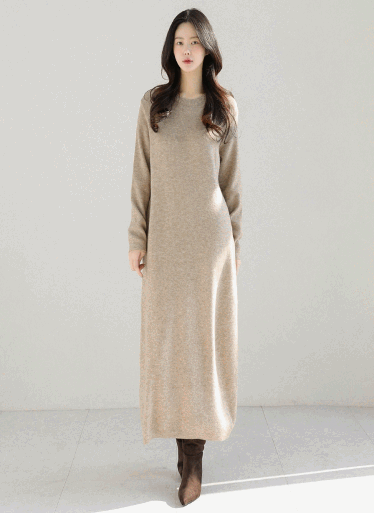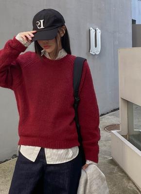 ウール混ラウンドネックオーバーサイズベーシック無地ニット