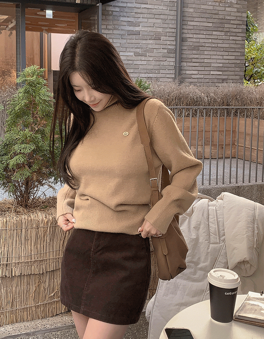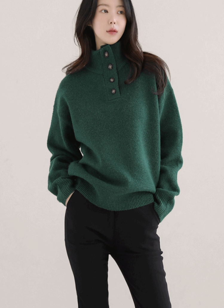 ソフトタートルネック長袖ルーズゴールドボタンペンダントニット