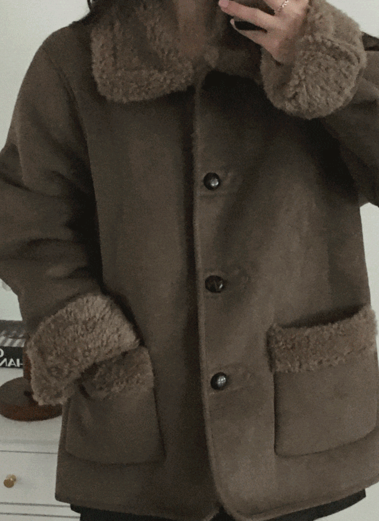 ボアムートンスエード調ボタンフードポケットルーズ長袖ジャンパー