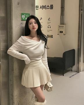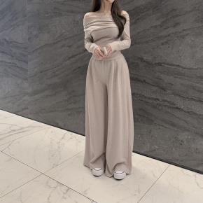 起毛ソフトピーチ起毛オフショルダーウエストゴムラップ調ロングギャザーセットアップパンツTシャツ