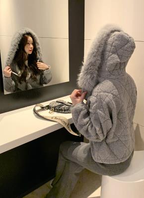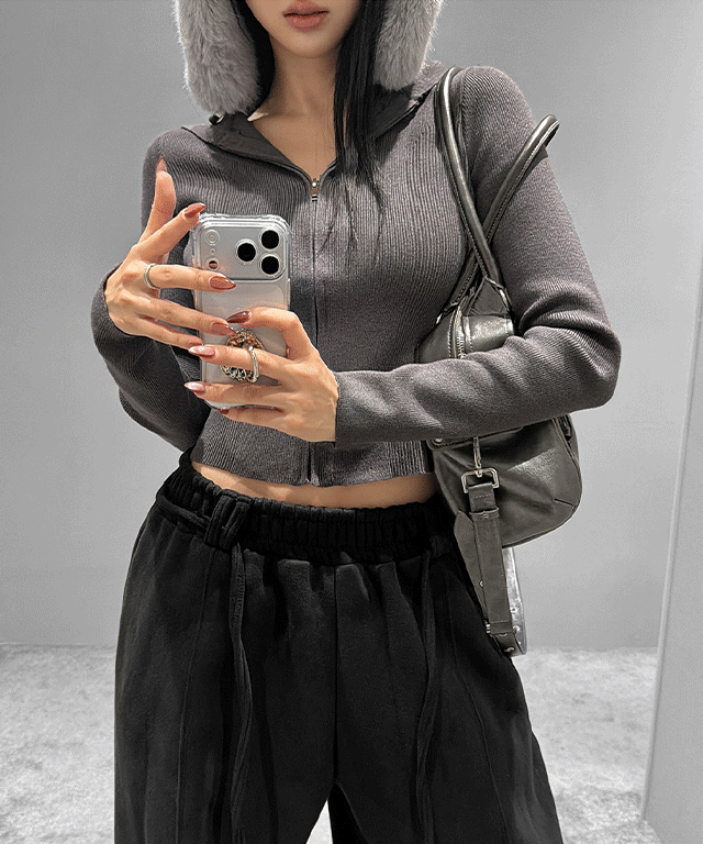 ニットエコファーフードダブルジップ長袖エンボスジップパーカー