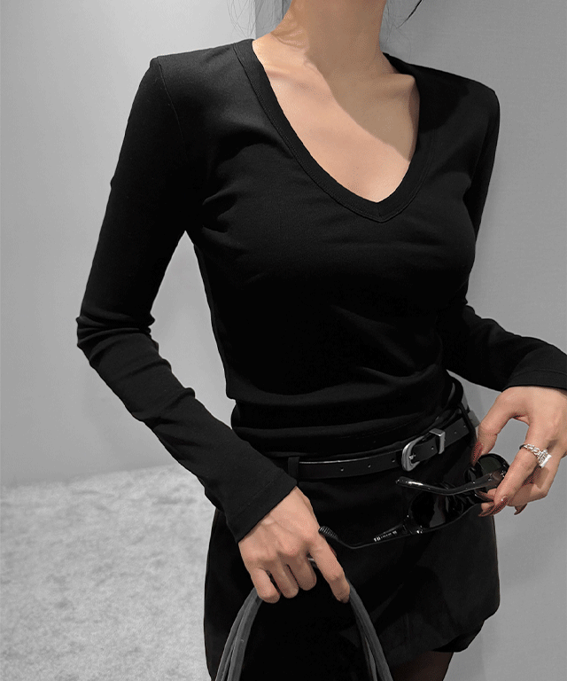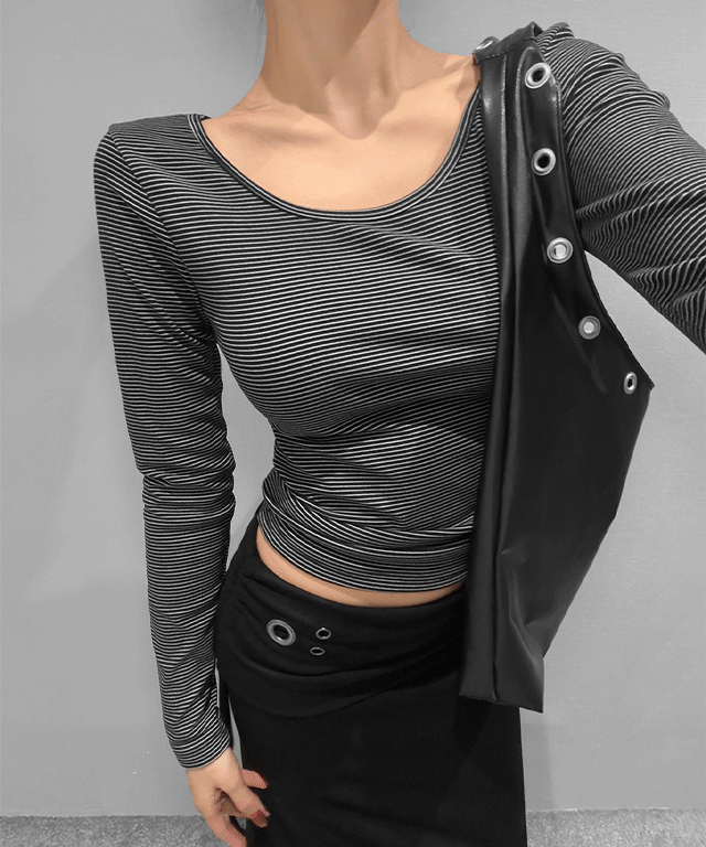 ストレッチラウンドネック長袖バックルストラップTシャツ