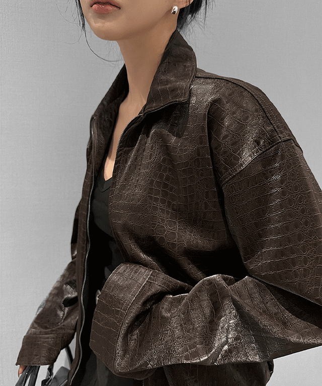 レザー調ジップアップポケットラウンドネックジャケット