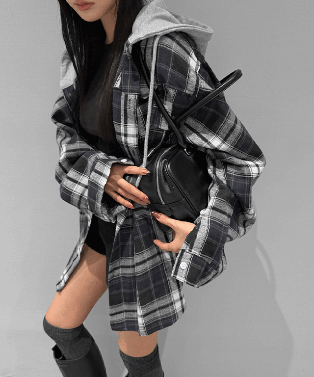 配色フード長袖ルーズボタンオーバーサイズチェックシャツ