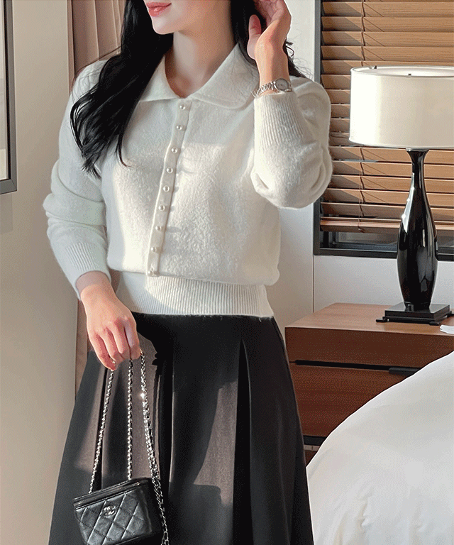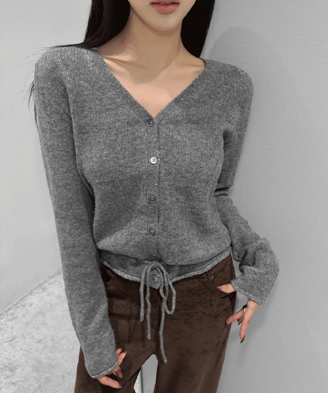 アンゴラ混Vネック長袖ボタンドローストリングカーディガン