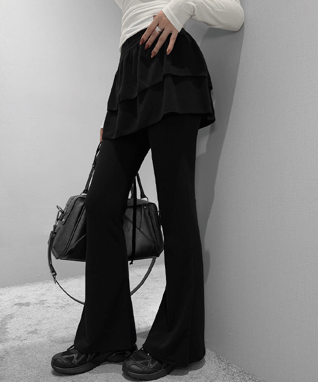 ストレッチロングウエストゴムフリルスリムレイヤード風スカートパンツトレーニング