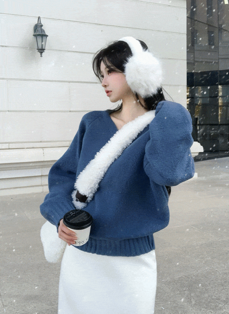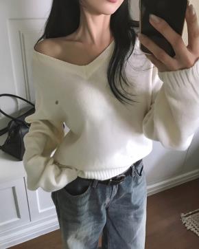 カシミヤ混ソフトVネック長袖ルーズベーシックニット