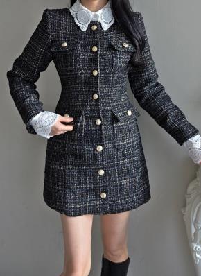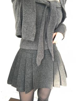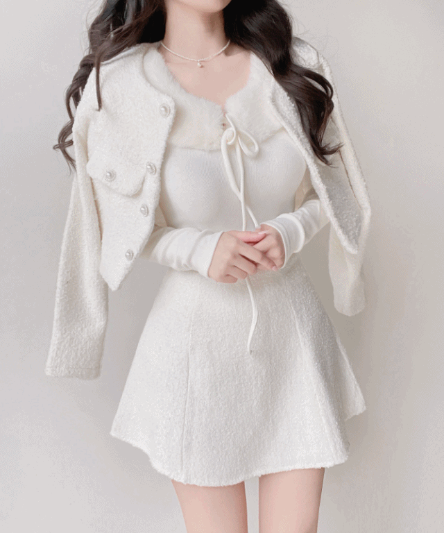 ツイードウール混ボタンボックスプリーツミニキャミワンピース