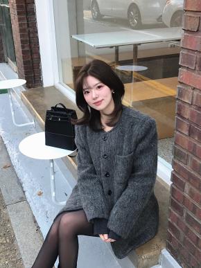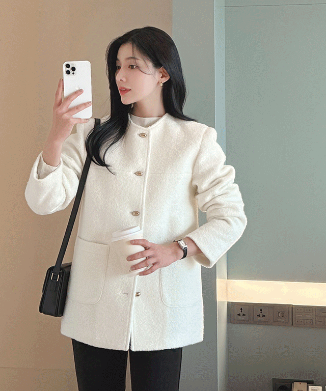 ウール混ノーカラー長袖ボタンポケットハーフネックコート