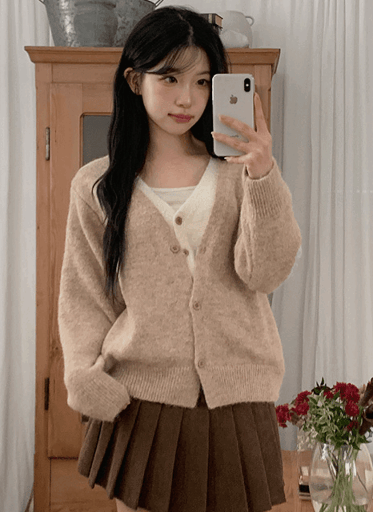 ウール混レイヤード風Vネックボタンカラーカーディガン