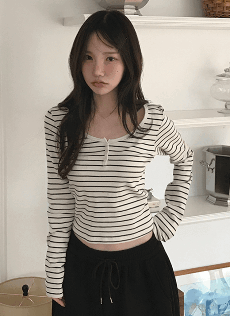 ストレッチ起毛ピーチ起毛スリム長袖ラウンドネックボーダーTシャツ