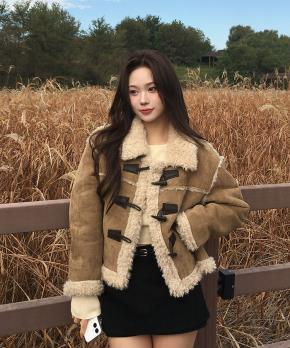 ムートンスエード調カラートグルボタンショート長袖配色ジャンパー
