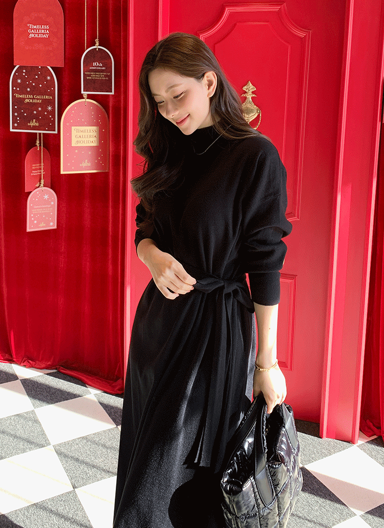ニットソフトストラップハーフネックスリットロング長袖ワンピース