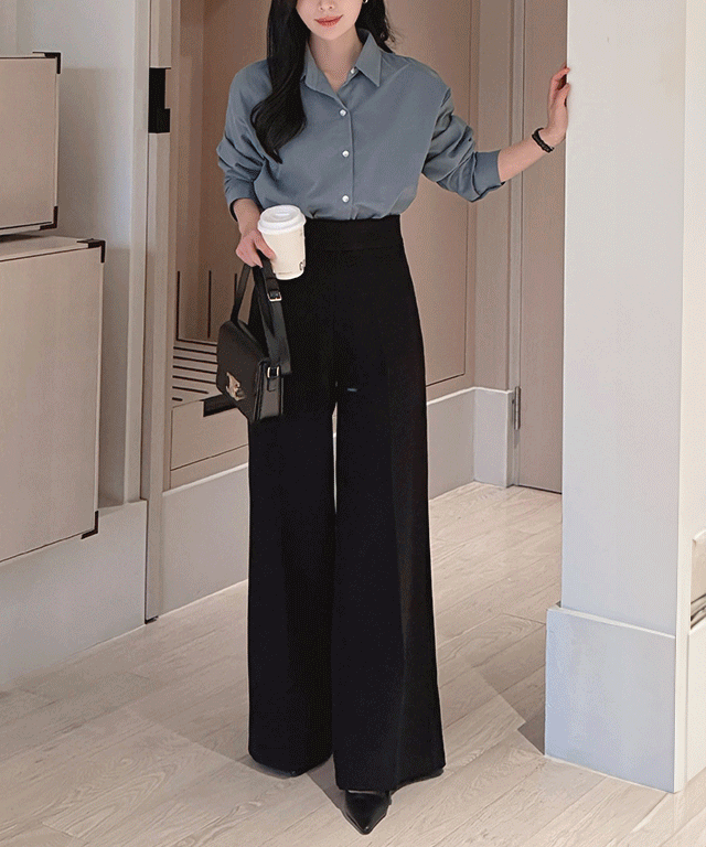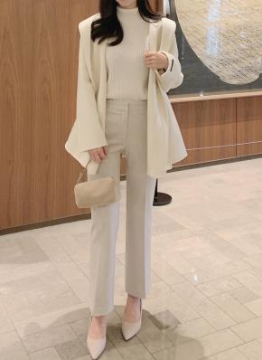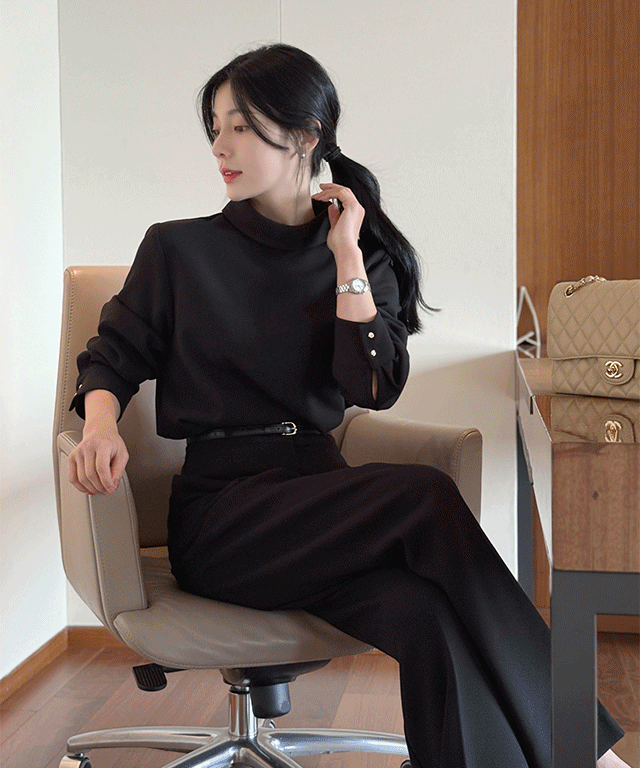 ワイドストレート長袖ハーフネックスリムロールアップセットアップスラックスブラウス