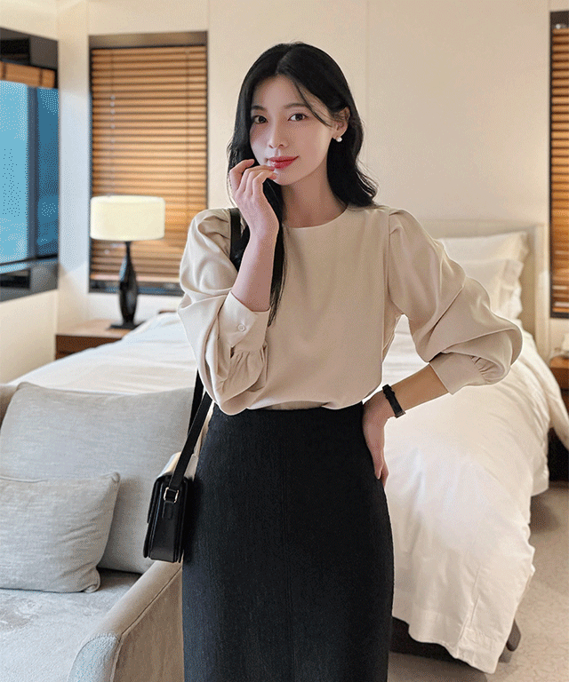 起毛ピーチ起毛ラウンドネックパフスリーブ長袖ギャザーブラウス