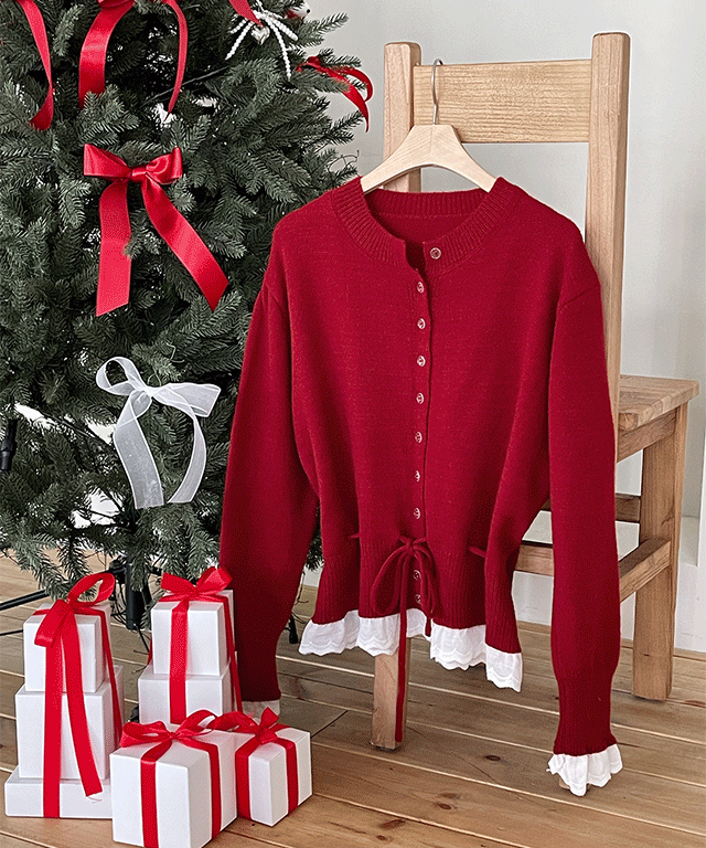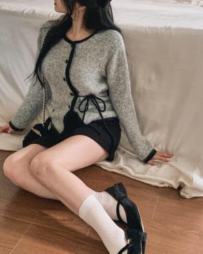 ソフトコンビ配色ニットドローストリング長袖ラウンドネックボタンスリムフリルレースカーディガン