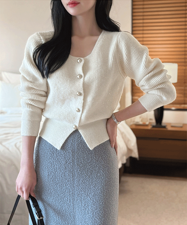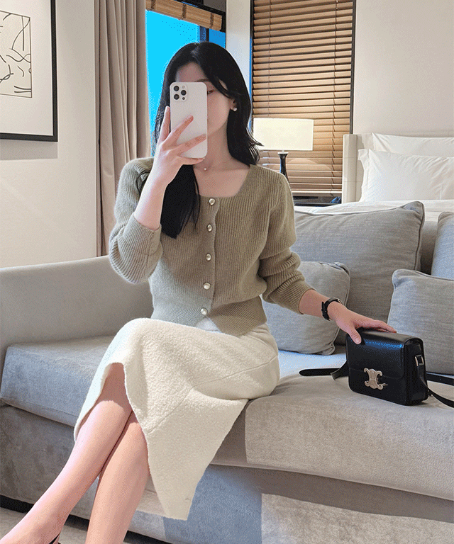 ニットスリムボタン長袖ベーシックスクエアネックカーディガン