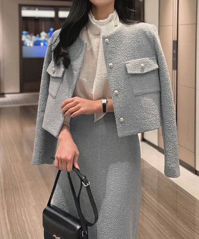 ツイードウール混ノーカラースリムHライン(ロング丈)ジップアップスリットボタンセットアップスカートジャケット