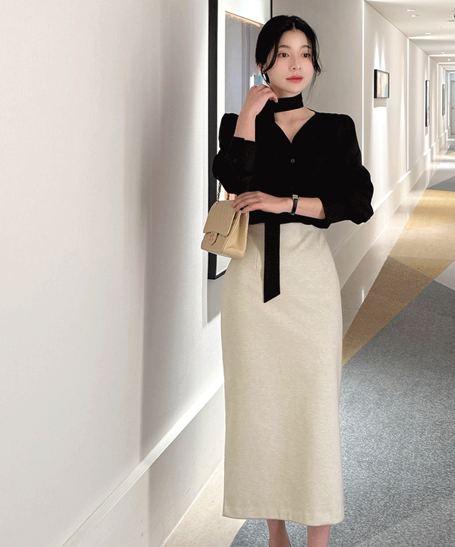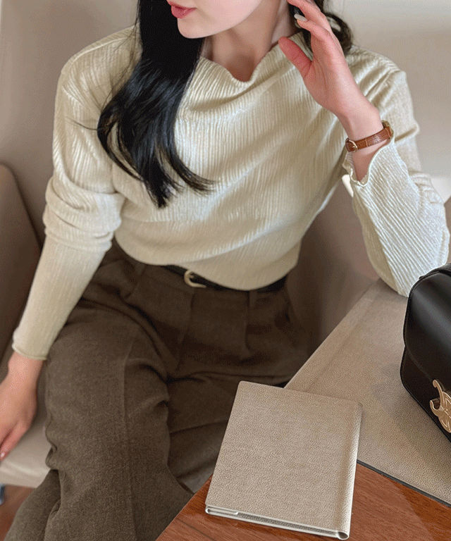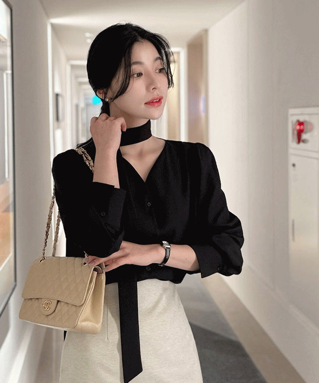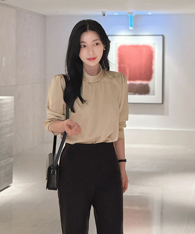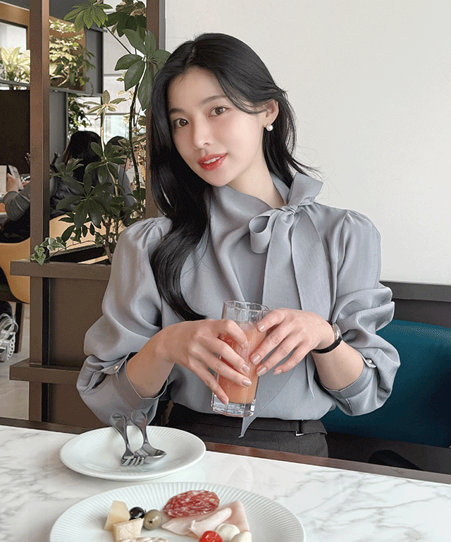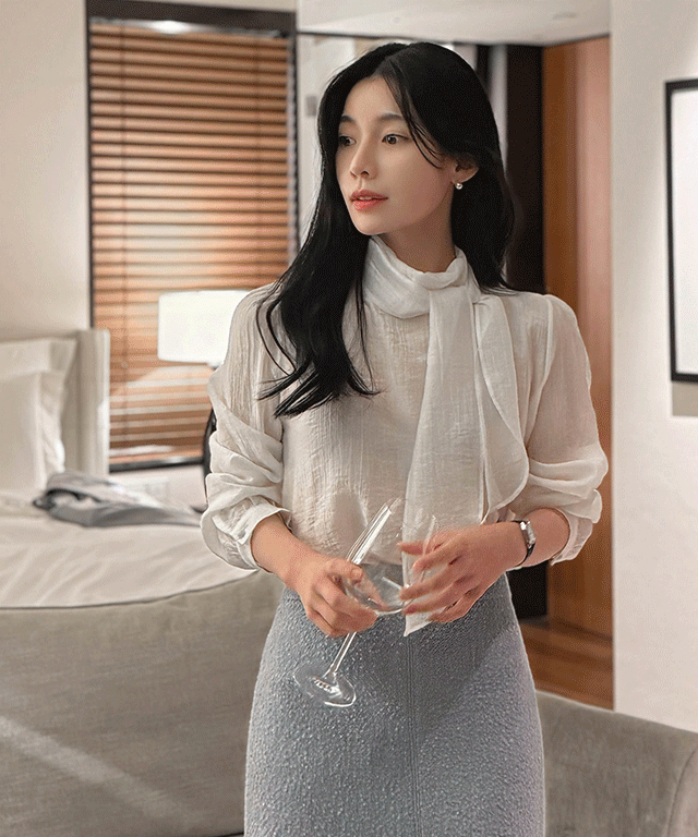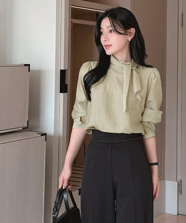 ボウタイハーフネックリンクル長袖グロッシーブラウス