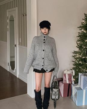 ニットストレッチボタンパフスリーブスリム長袖カーディガン