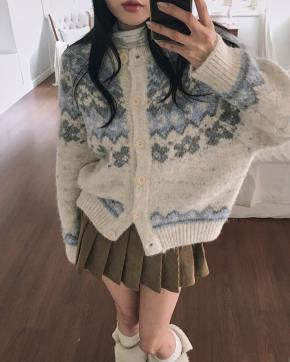 ニットコンビ配色ボタンラウンドネックフリル長袖カーディガン