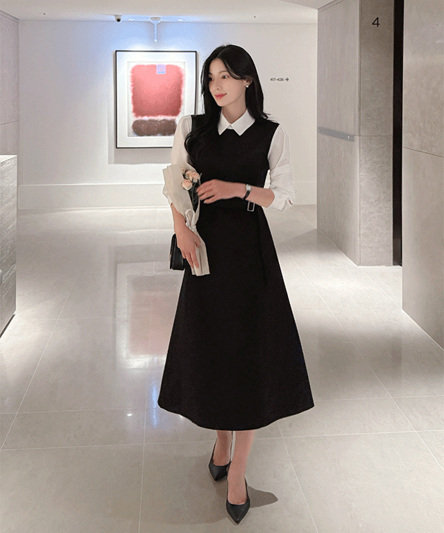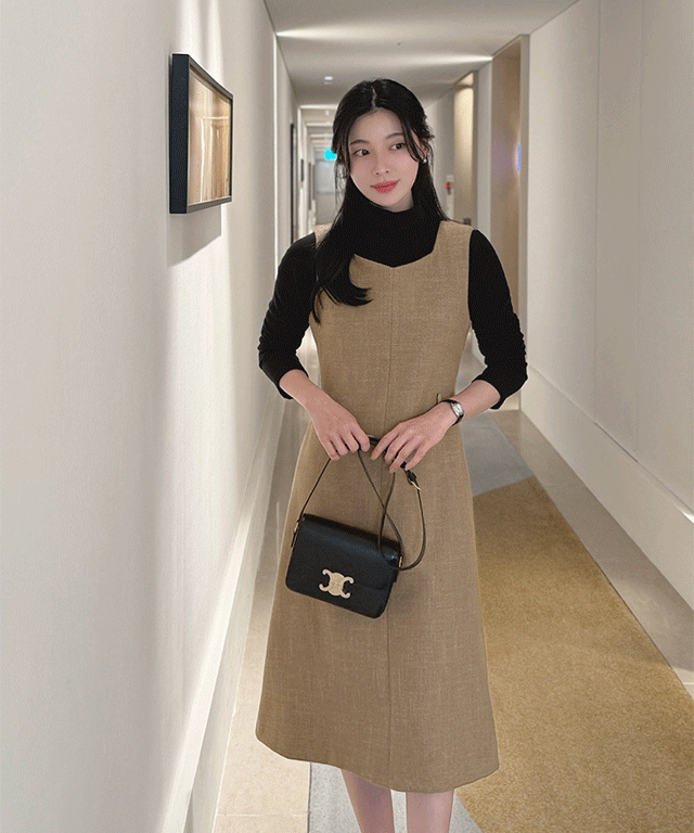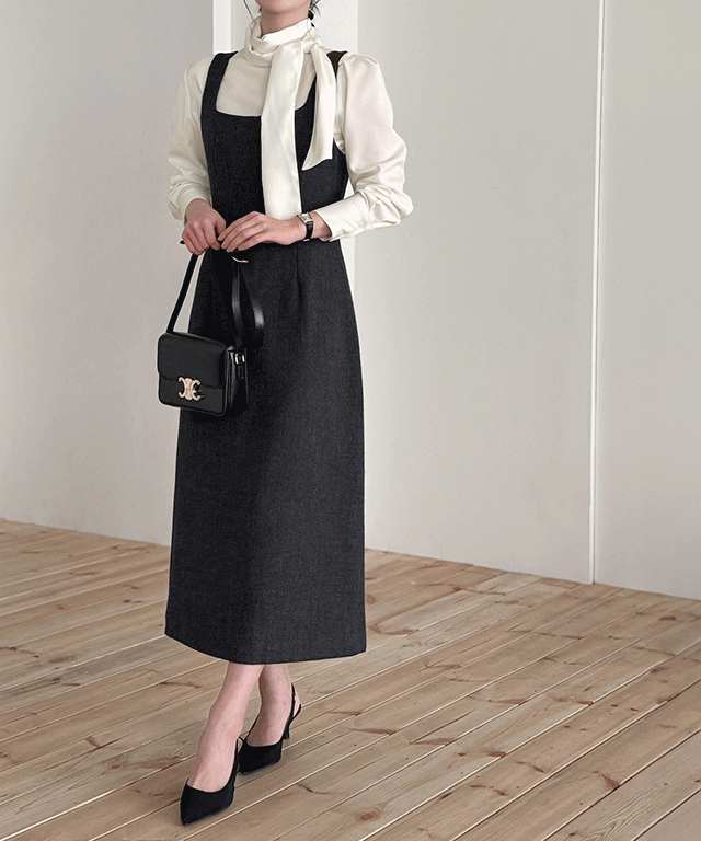 メルトンタッチジップアップスリムロングバックストラップビスチェワンピース