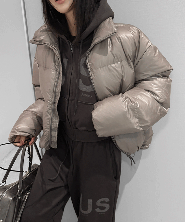 ウェルロン長袖ハイネックジップアップポケットグロッシーダウンジャケット
