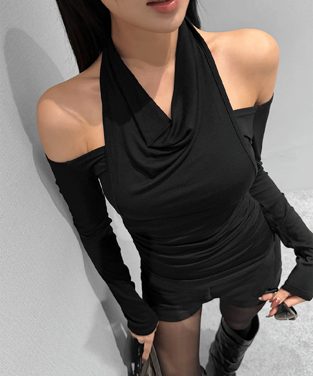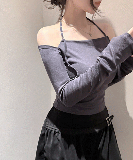 ストレッチスリム長袖ホルターネックアイレットギャザーオフショルダーTシャツ