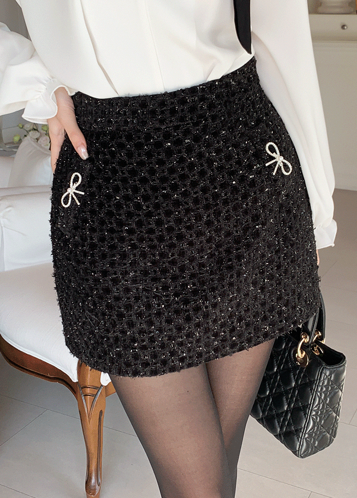 ツイードジップアップスリムミニリボン柄スカートブローチ付