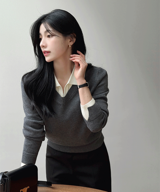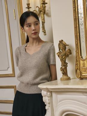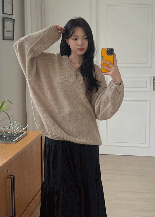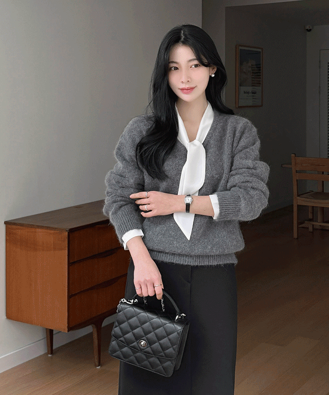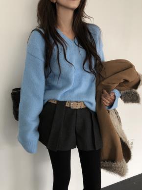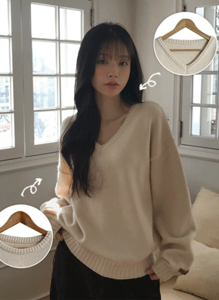 アンゴラ混ウール混ソフトVネック長袖ベーシックニット
