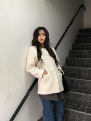 キルティング中綿ウール混ボタンラウンドネック長袖ジャケット