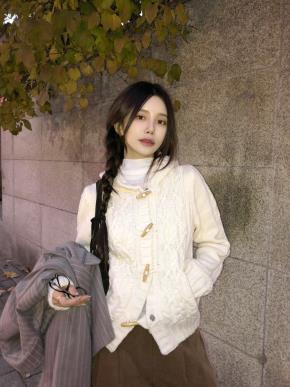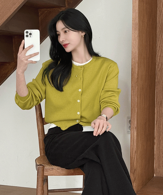 リブウール混ボタンラウンドネックVネック長袖無地カーディガン2TYPE