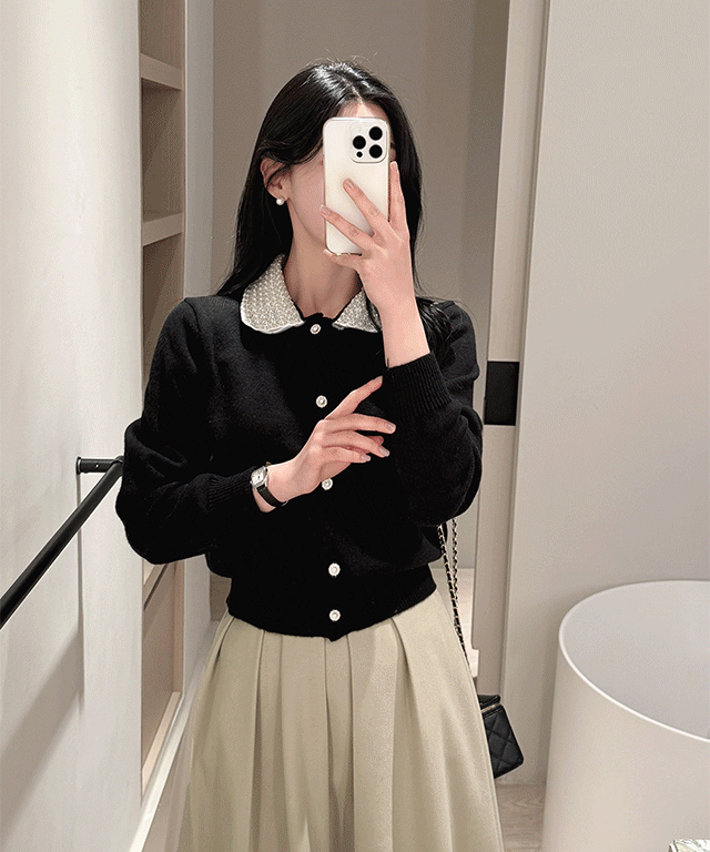 エコパールウール混ビジューボタンカラー長袖スリムカーディガン