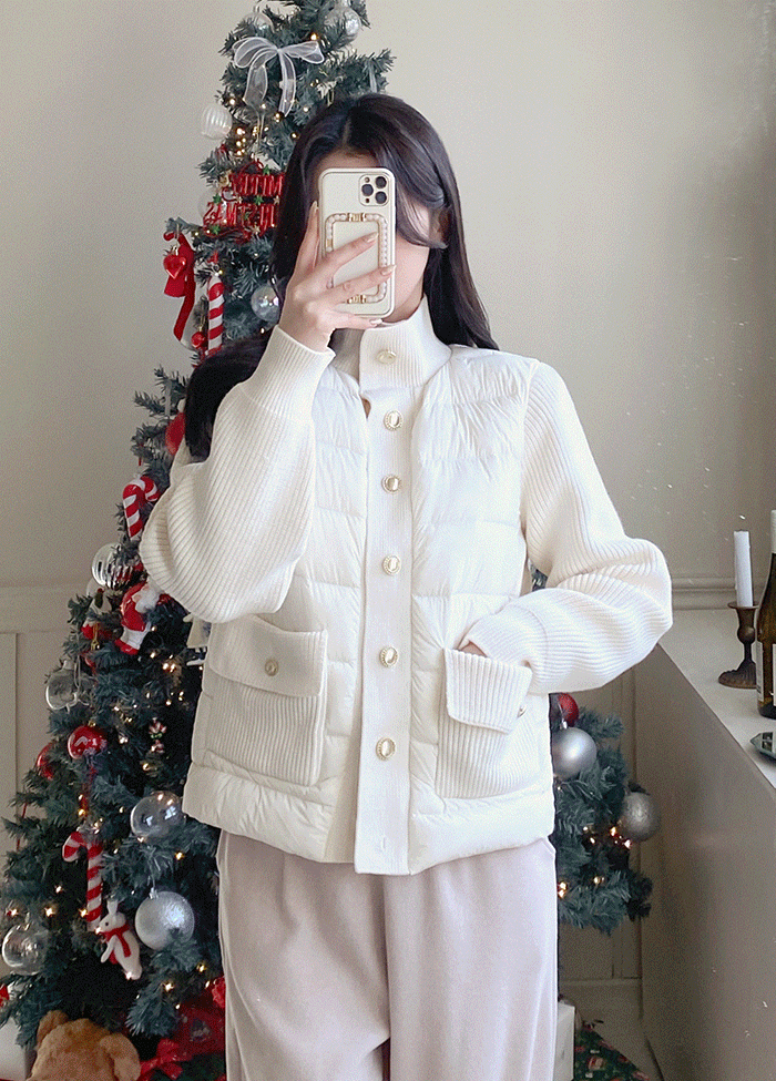 ニットダックダウンコンビボタンハイネックポケット長袖軽量ダウンジャケット