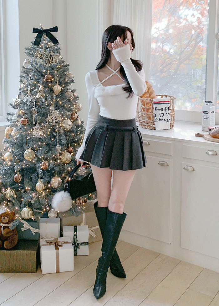 エコファーレザー調リボン長袖ショートハイネックジャンパー