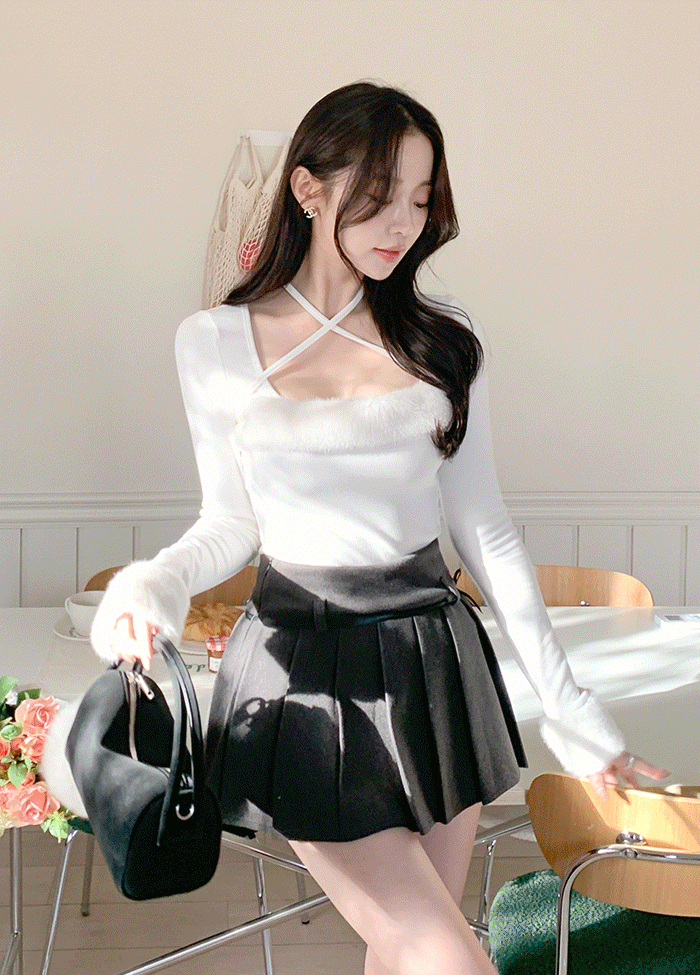 両起毛オフショルダーホルターネックストラップ長袖Tシャツ