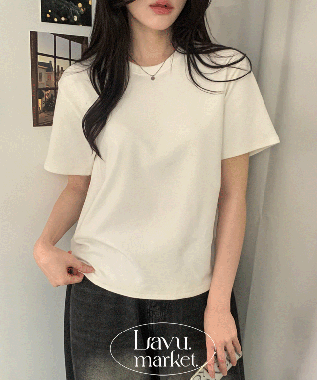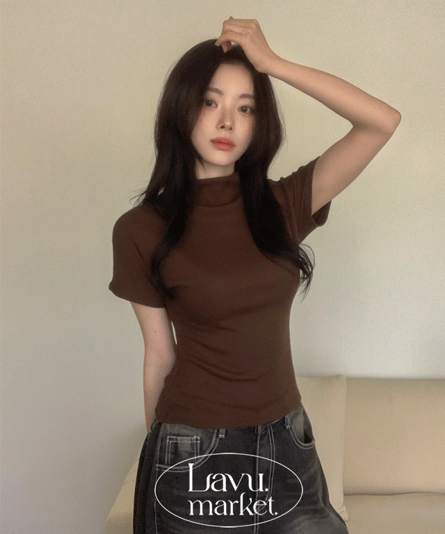 リブストレッチ半袖ハーフネックスリムフレンチスリーブTシャツ