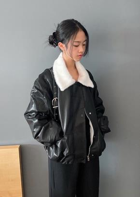 ファー裏地レザー調フードレイヤード風ルーズジャンパー