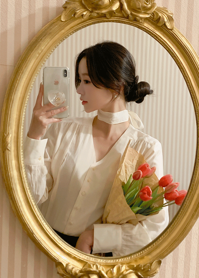 ボタンVネックノーカラーピンタックルーズ長袖ブラウスストラップ付