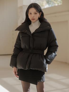 ダックダウンベルトハイネックポケットダブルジップドローコードスナップボタンハーフダウンジャケットベルト付
