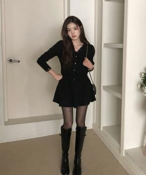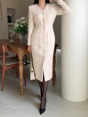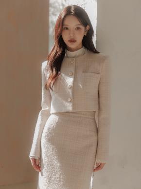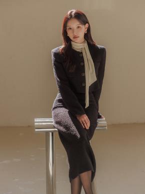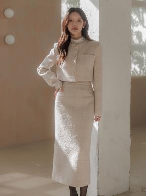 ツイードボタンジップアップノーカラースリムロング長袖セットアップスカートジャケット