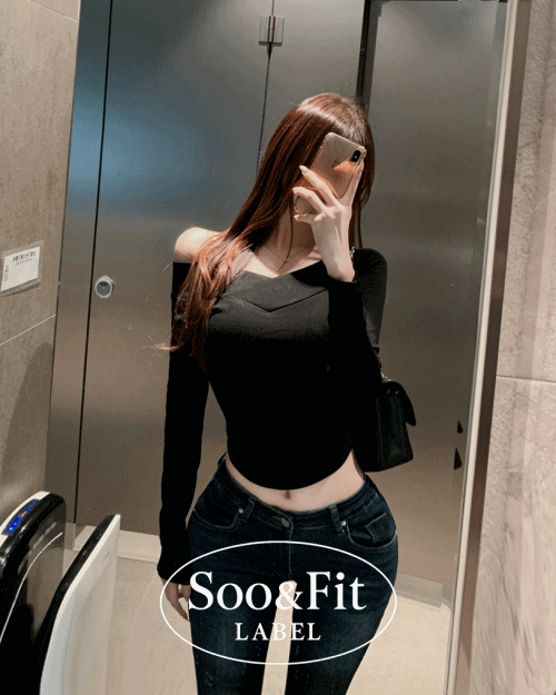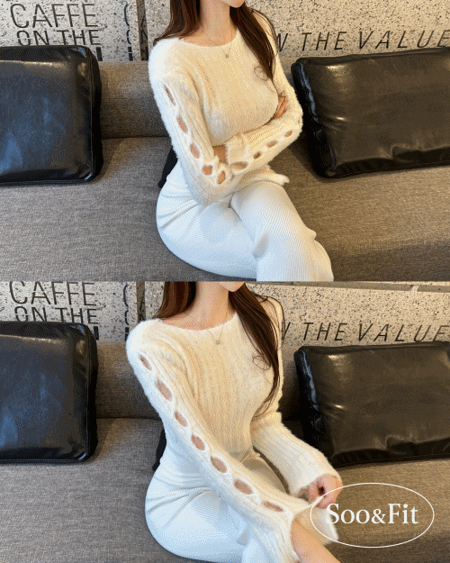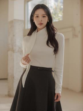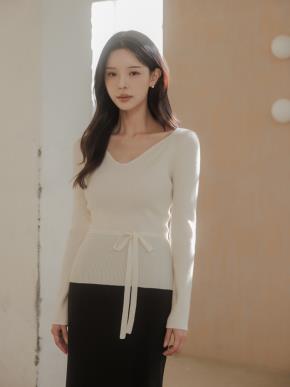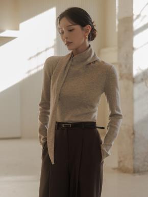 リブオープンカラースリム長袖ダイアゴナルニットストラップ付