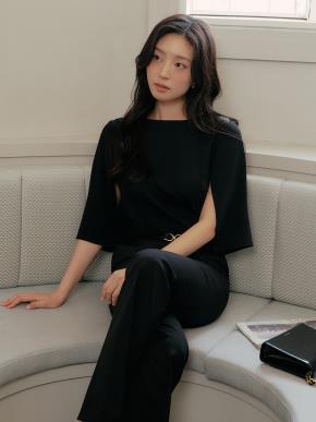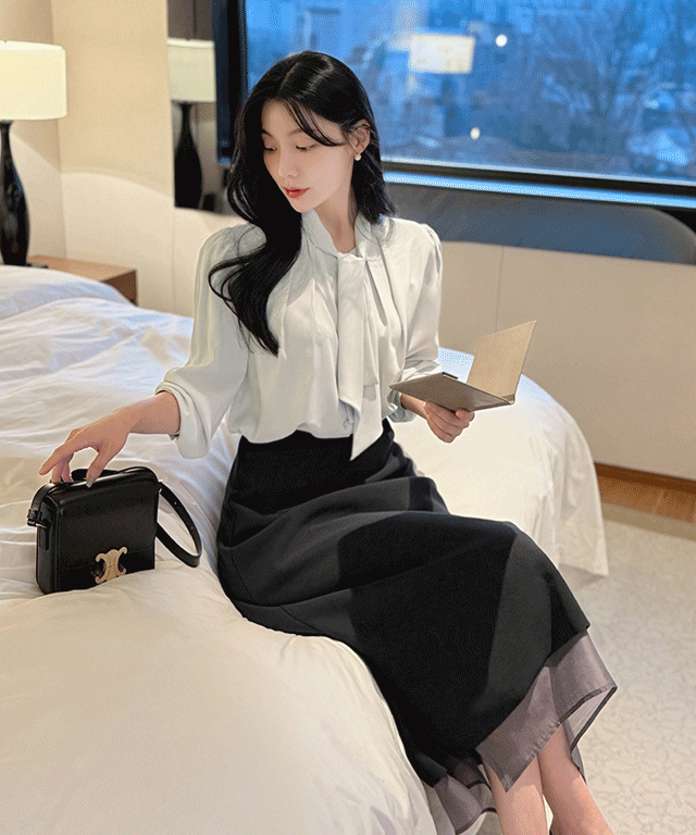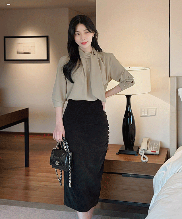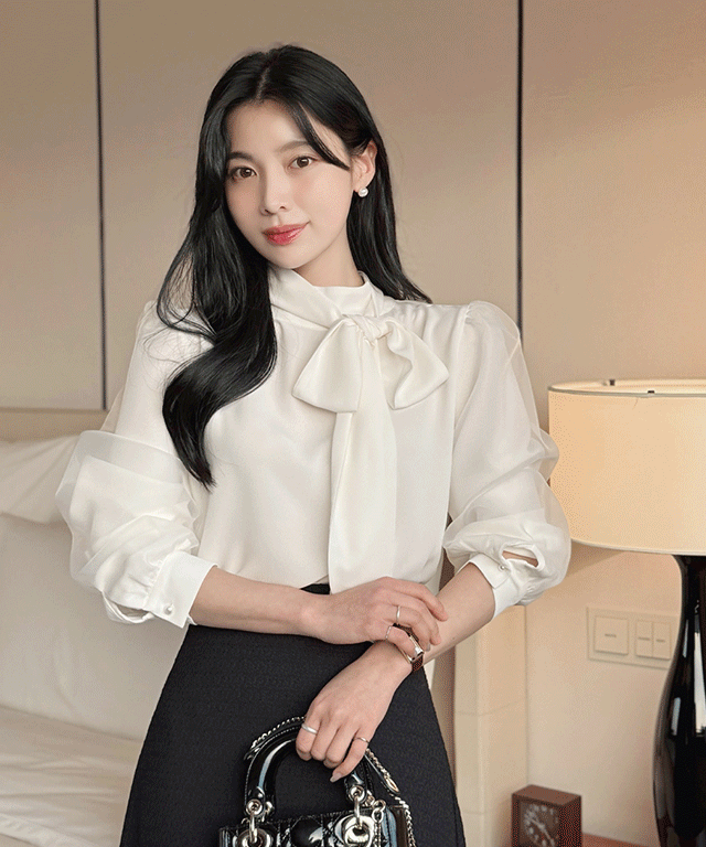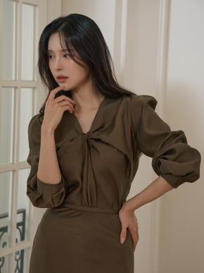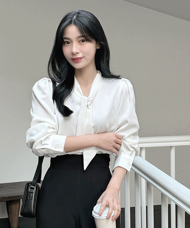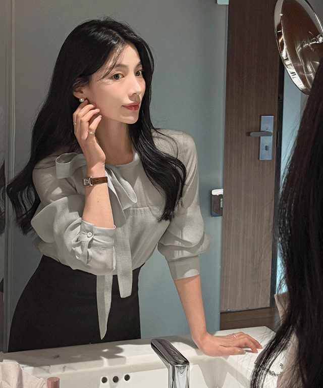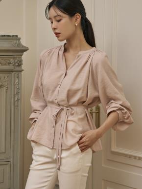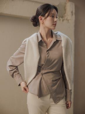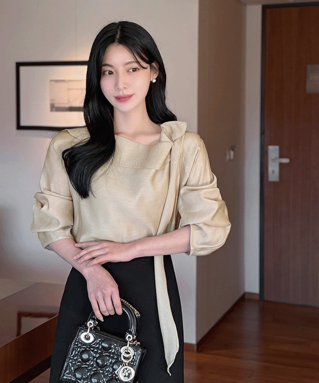 リボンドレープラップオープンカラーラインギャザーダイアゴナルブラウス